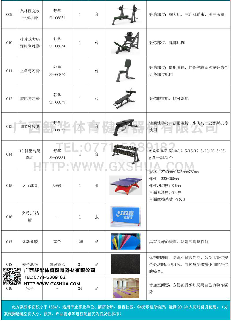 史密斯机(1台)、深蹲架(1台)、水平推举椅(1台)、多重可调节练习椅(1台)、腹肌训练器(1台)、罗马椅(1台)、上斜练习椅(1台)、10付哑铃套组(1套)、可调哑铃凳(1张)-可以实现对不同肌肉群的针对性训练,满足肌肉训练需求,全方位激活身体机能。
