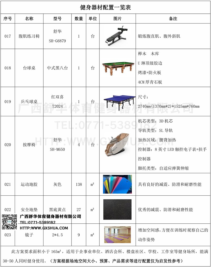 此方案要求面积小于165m²,适用于企事业单位、酒店会所、楼盘社区、学校、工作室等健身场所,能满30-50人同时健身使用。(方案根据场地空间大小、预算、产品需求等进行配置仅为启发性参考)